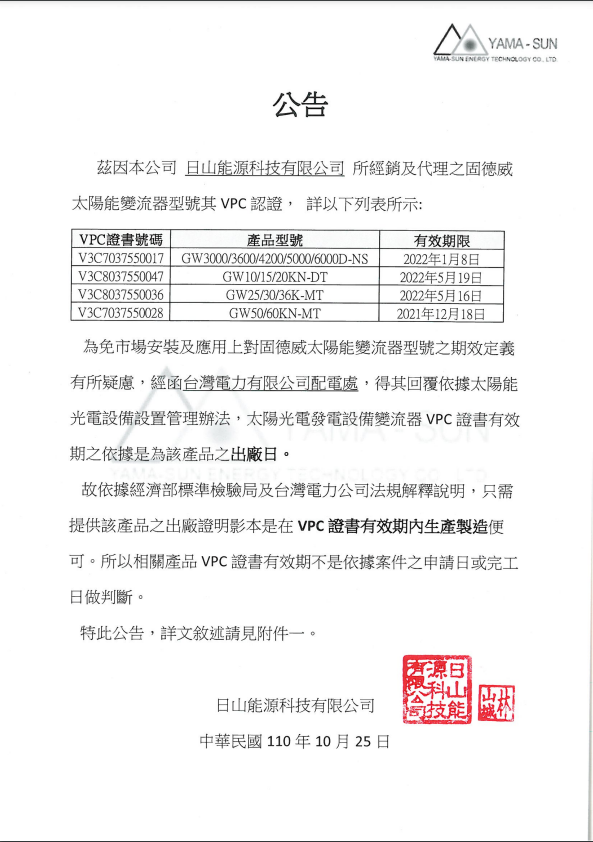 為免市場安裝及應用上對固德威太陽能變流器型號之期效定義有所疑慮,經函台灣電力有限公司配電處,得期回覆依據太陽能光電設備管理法,太陽光電發電設備變流器VPC證書有效期之依據是為該產品之出廠日。 故依據經濟部標準檢驗局及台灣電力公司法規解釋說明,只需提供該產品之出廠證明影本是在VPC證書有效期內生產製造便可。所以相關產品VPC證書有效期不是依據案件申請日或完工日做判斷。